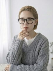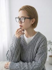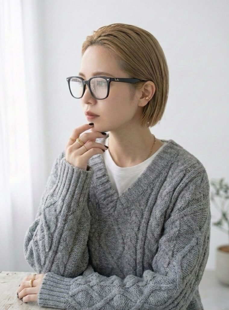 グレーのケーブルニットとすっきり合わせた、こなれ感たっぷりのショートボブ。メガネとの相性もよく、知的でおしゃれな印象に。さりげない前髪のセットで、顔まわりを明るく見せます。