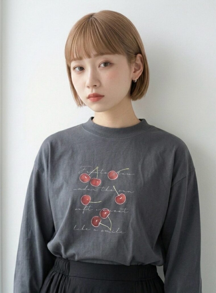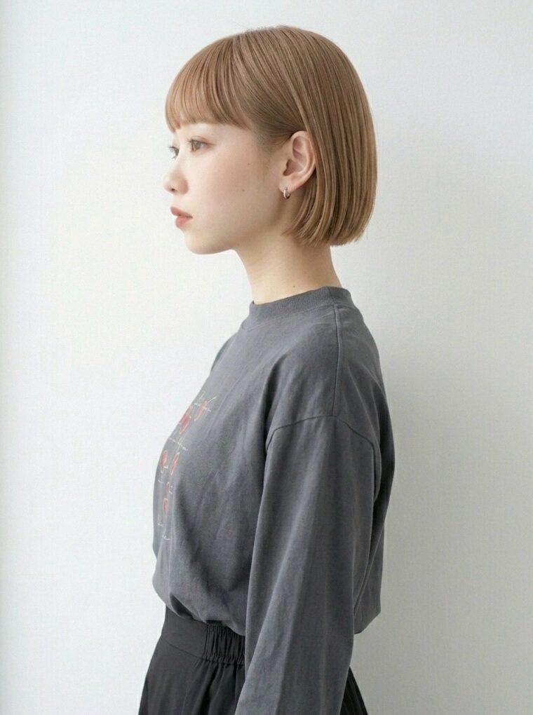 グレーの花刺繍スウェットとさりげなく調和する、ふんわりとした丸みのあるショートボブ。ナチュラルな束感を出すことで、抜け感と女性らしさを同時に演出します。